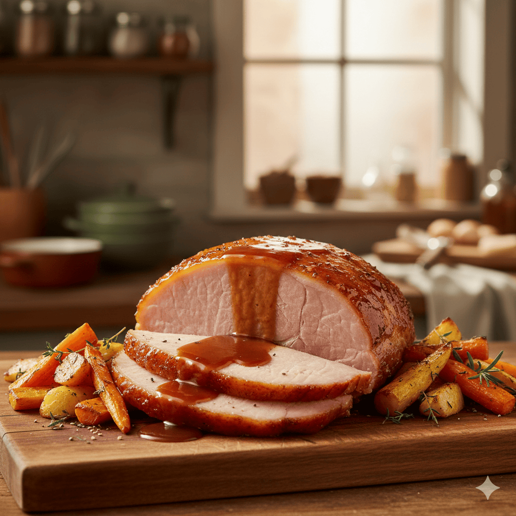Slow-roasted ham with honey and mustard glaze, served with roast vegetables.