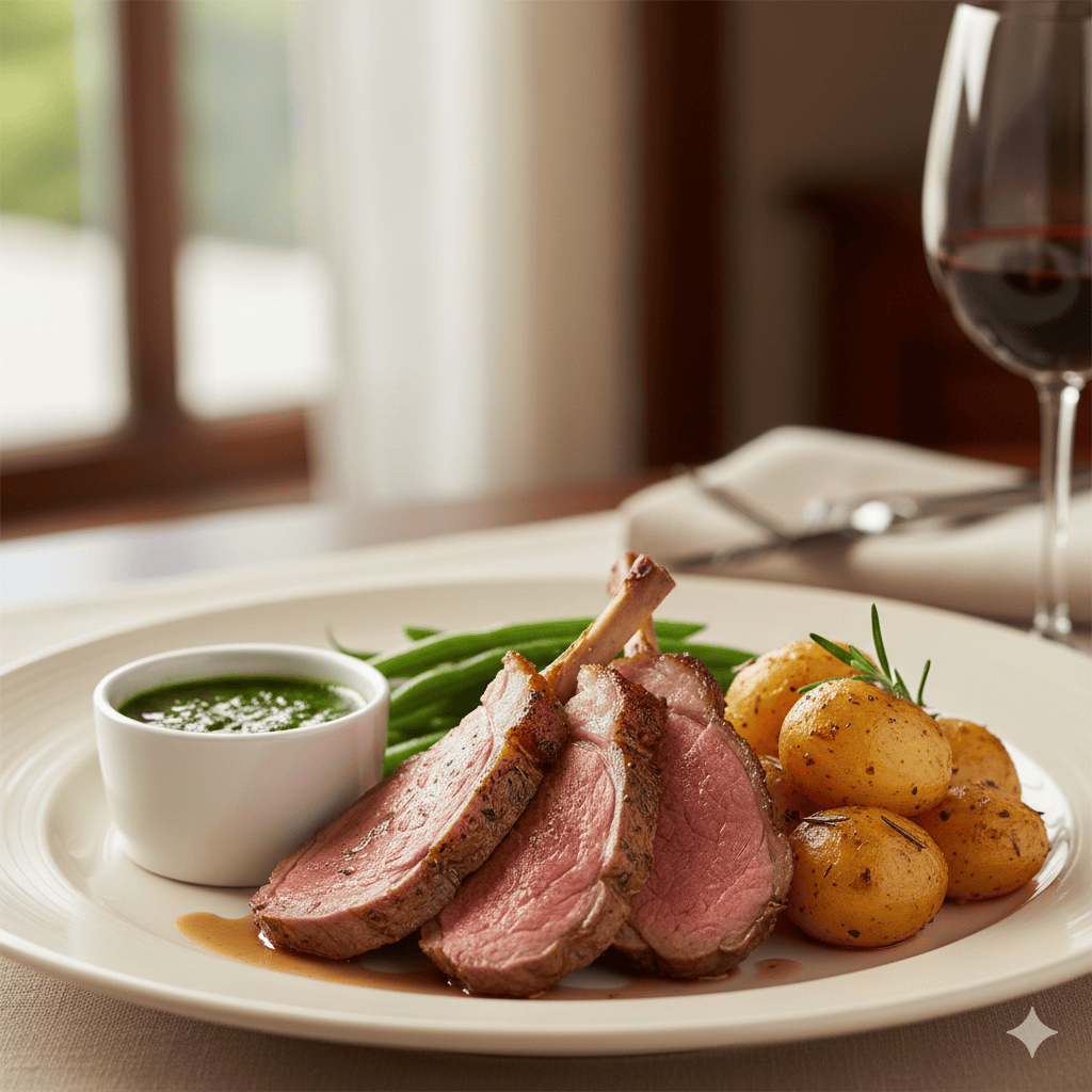 Tender roasted lamb served with mint sauce and crispy roast potatoes.