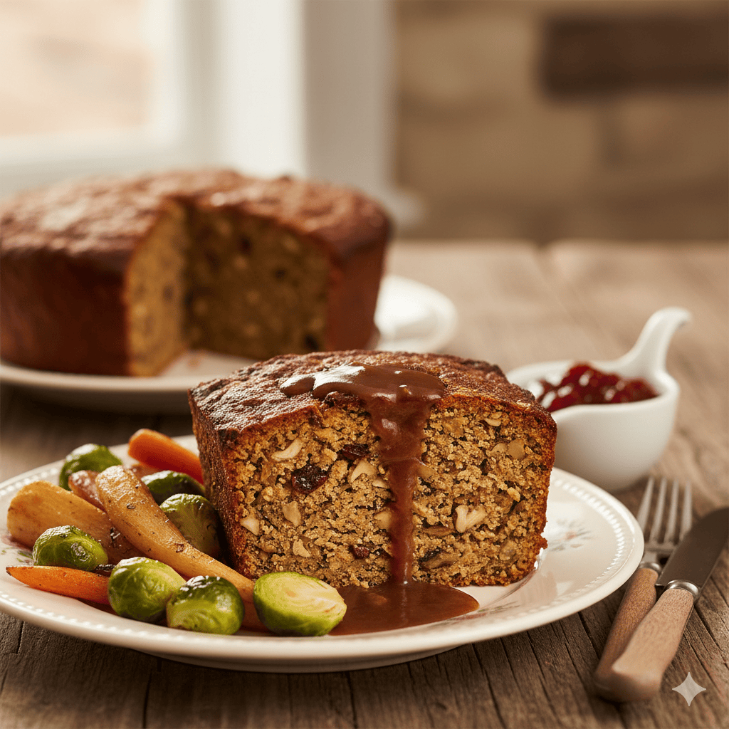 Wholesome nut and lentil roast served with vegetarian gravy and roasties.