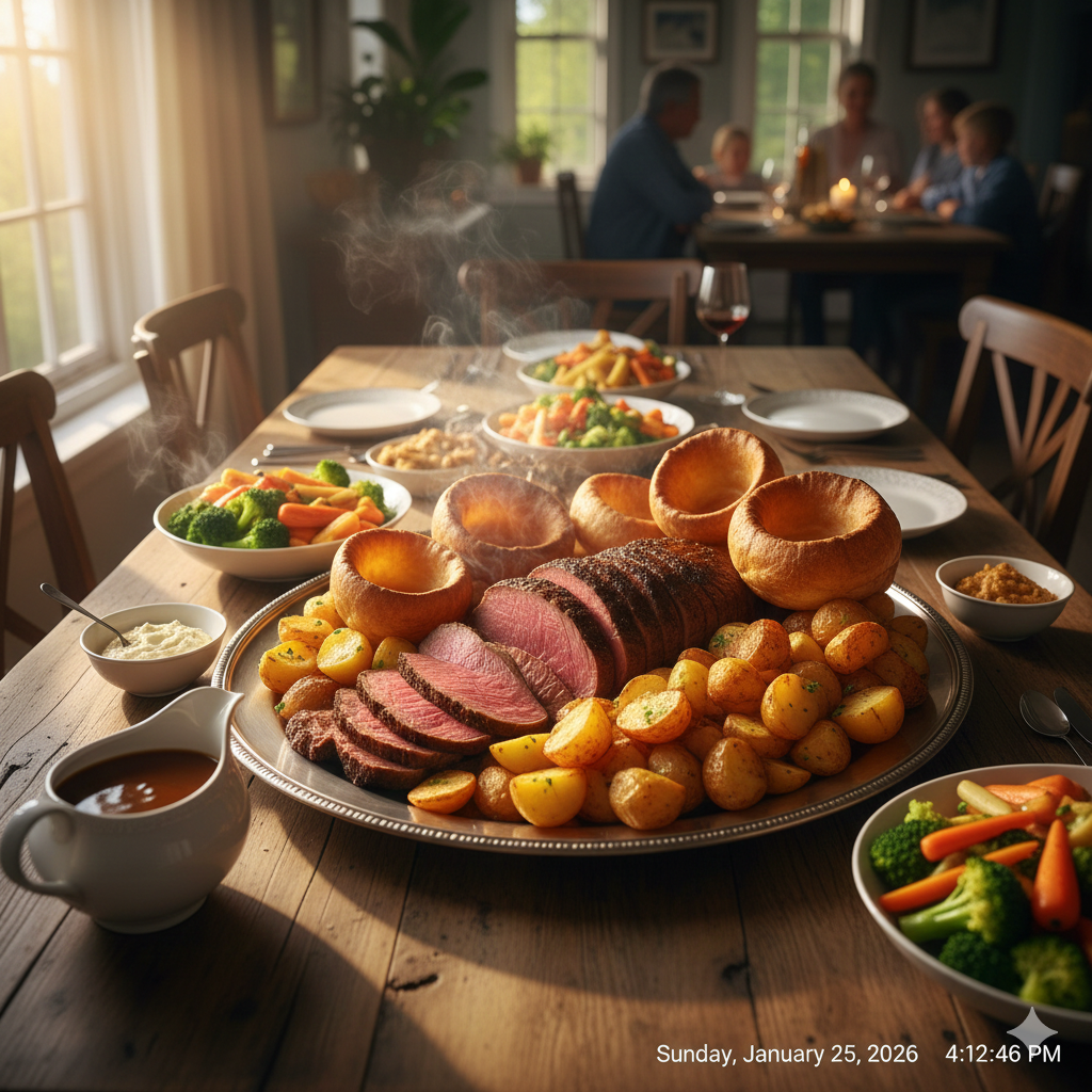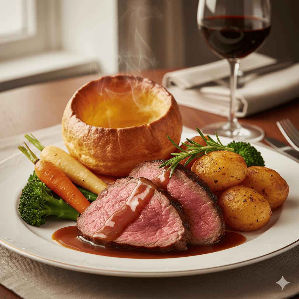 Dry-aged roast beef, Yorkshire pudding, roasted potatoes, and seasonal greens.