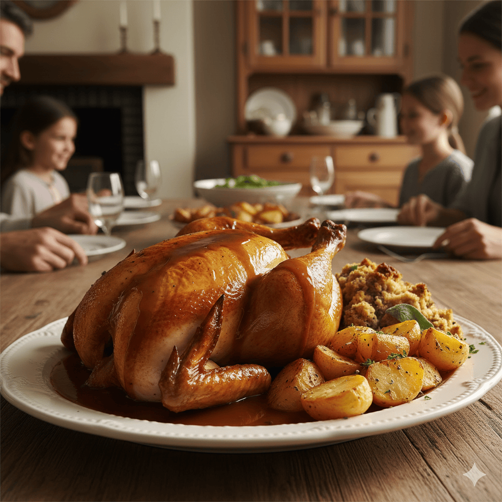 Half roast chicken with sage and onion stuffing and seasonal trimmings.